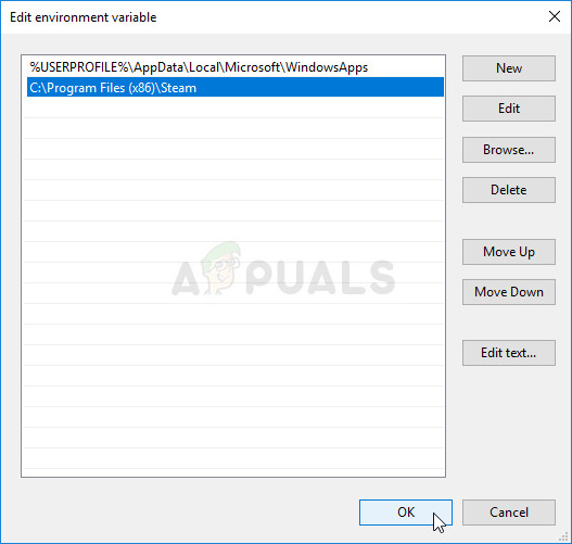 - Paste this in the Edit environment variable window and click OK. Try reopening the game and check to see if it will run from Steam now.