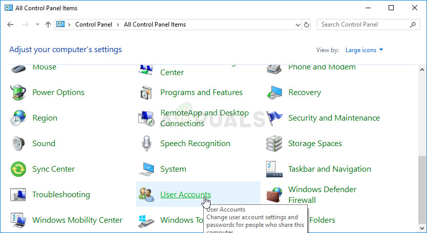 - Change the View by option in Control Panel to Large Icons and locate the User Accounts option by scrolling or looking at the bottom.