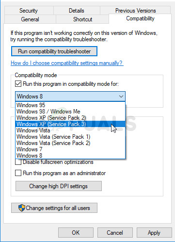 - Navigate to the Compatibility tab in the Properties window and check the box next to the “Run this program in compatibility mode for:” setting under the Compatibility mode section. Click the dropdown menu and choose Windows XP Service Pack 3 from the list.