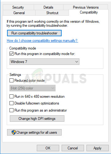 - Navigate to the Compatibility tab in the Properties window and check the box next to the “Run this program in compatibility mode for:” option under the Compatibility mode section. Click the dropdown menu and choose Windows 7 from the list.