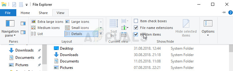 - Click on the “View” tab on File Explorer’s menu and click on the “Hidden items” checkbox in the Show/hide section. File Explorer will show the hidden files and will remember this option until you change it again.