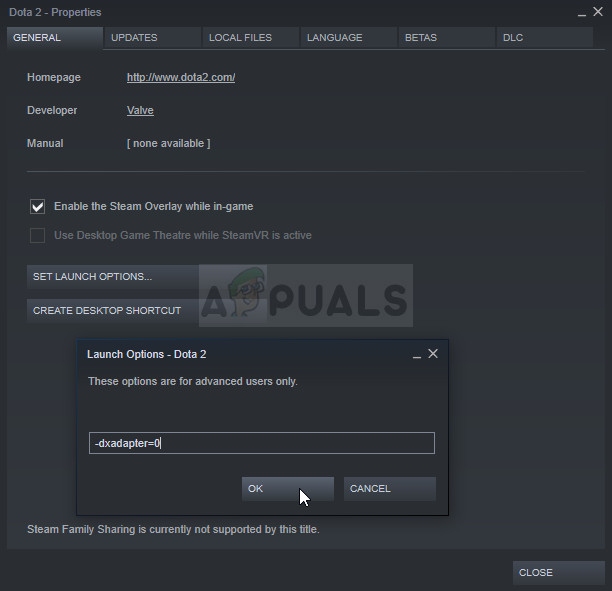 - Type in “-dxadapter=0” in the Launch Options window. If there were some launch options from before in the window, make sure you separate them by a space. Check to see if the game still crashes on your computer.