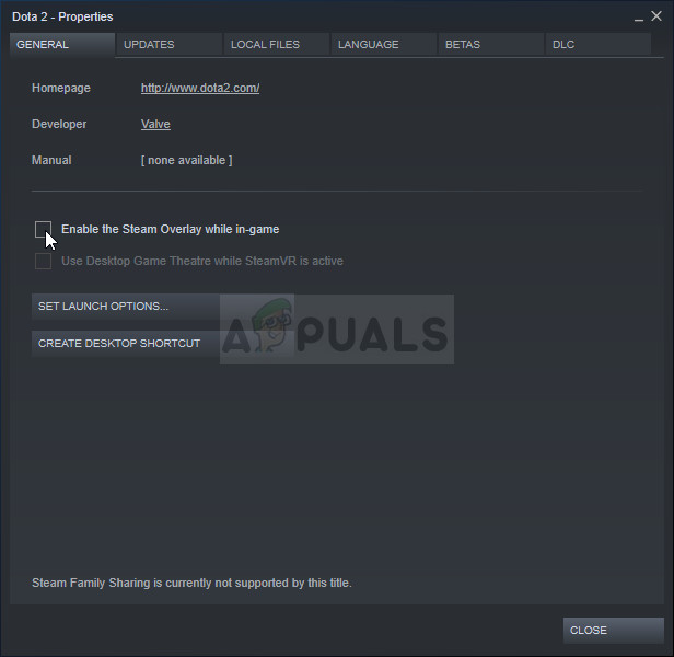 - Right-click the game’s entry in the library and choose the Properties option from the context menu which will appear. Stay in the General tab in the Properties window and clear the box next to the “Enable the Steam Overlay while in-game” entry.