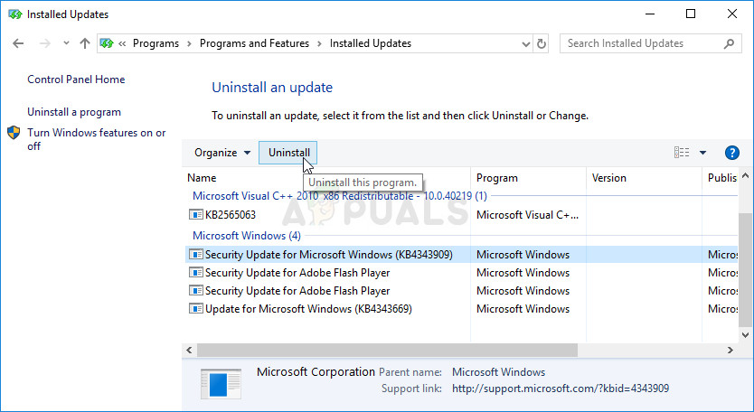 - Click on the update once and choose the Uninstall option at the top and follow the instructions which will appear on screen in order to get rid of the update.
