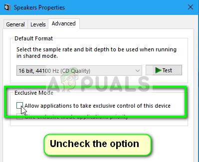 - Select the Advanced tab and uncheck the exclusive mode options. Save your changes and exit.