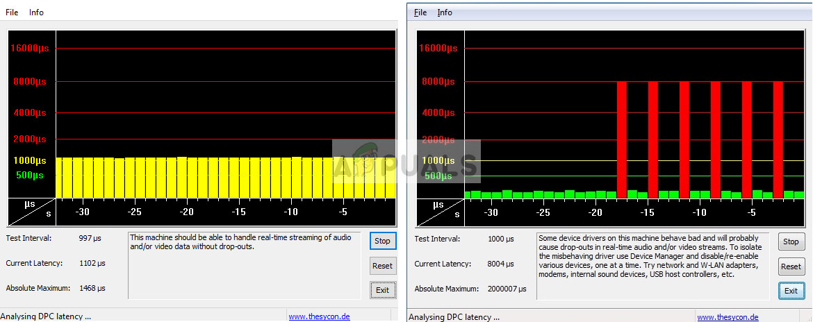 In the example showing on the left side, there’s a driver causing high latency about every three seconds. If this is the case, you have to troubleshoot yourself, enabling and disabling each driver one at a time to identify the issue.