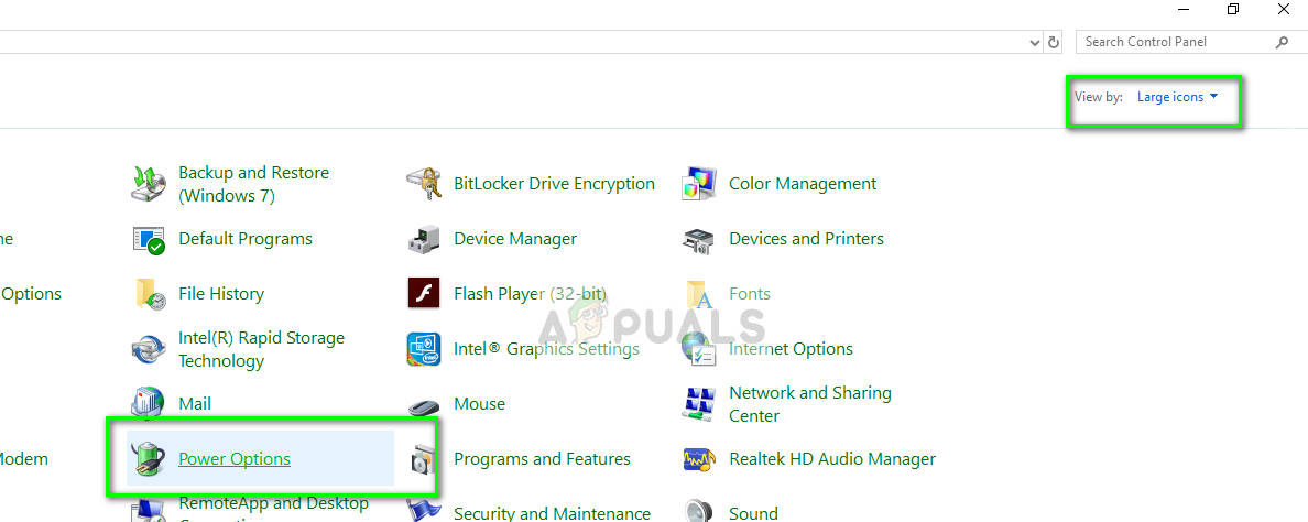 - In the Control Panel, select Large icons and click on Power Options.