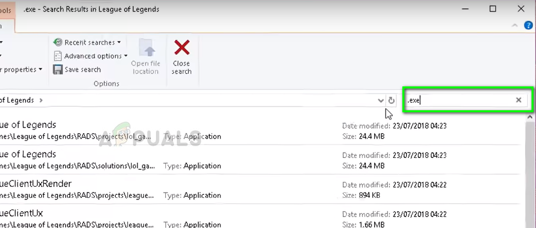 - Go to the Installation folder of League of Legends. Type ‘.exe’ in the search box and press Enter.