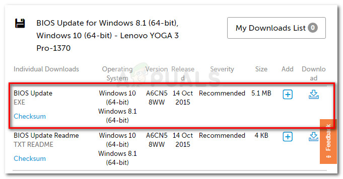 - Visit this link (here) and download the BIOS Update executable from the Download section. Make sure that you have this exact model. If your model is different, punch in your serial number in the search box and download the required BIOS update associated with your mode.