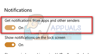 - You can also disable the notifications for all the applications by toggling the option “Get notifications from apps and other senders”.