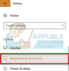 - Select “Notifications and actions” using the navigation pane present at the left side of the screen.