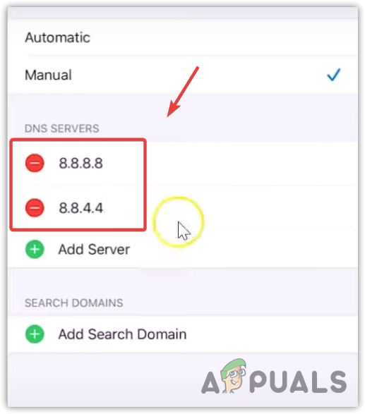 - Under DNS Servers, tap on the Minus button and tap Delete to remove the current DNS address.