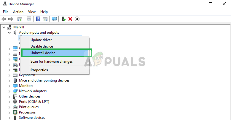 Navigating to Audio inputs and outputs in Device Manager - Then Right-Click ON the Microphone and select Uninstall Device