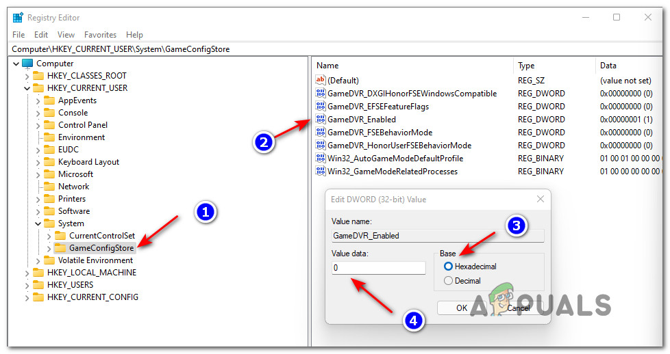 Disabling Game DVR - Still in GameConfigStore, find GameDVR_FSEBehaviourMode, double-click it, set Base to Hexadecimal, and Value data to 2. Click Ok.