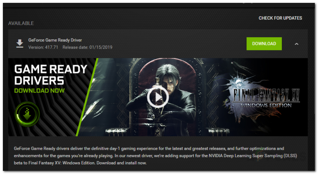 - In Nvidia Experience, go to the Driver tab and click Check for Updates. If an update is available, click Download and follow the instructions to install the new driver and physics module.