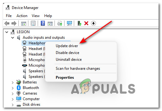 Open Device Manager on Windows 11 - Right-click on the audio device under Audio inputs and outputs and select Update driver.