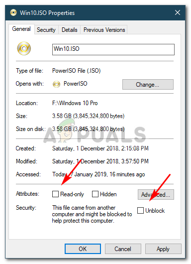 If you receive an ‘Access Denied’ message after entering the command, you can fix this by removing the Read-only attribute of the ISO file through its properties. Also, make sure that the ‘This file came from another computer and might be blocked to help protect this computer’ option is unchecked. Thereupon, enter the command in the Windows Powershell again.