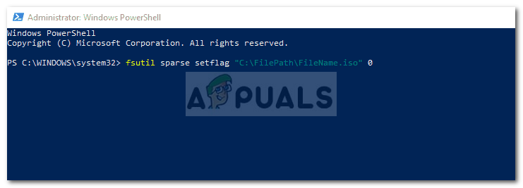 fsutil sparse setflag "C:\FilePath\FileName.iso" 0