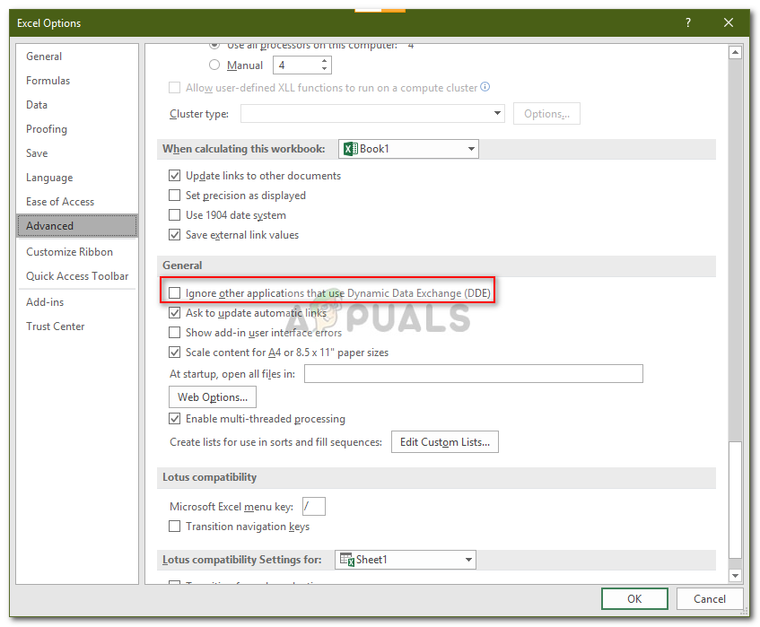 Sometimes, the issue occurs when your Microsoft Excel has the DDE or also known as Dynamic Data Exchange enabled. This option lets other applications on your system subscribe to the items of Microsoft Excel. To fix this, you will have to make sure that the ‘Ignore DDE’ option is unchecked in Microsoft Excel. Here’s how: