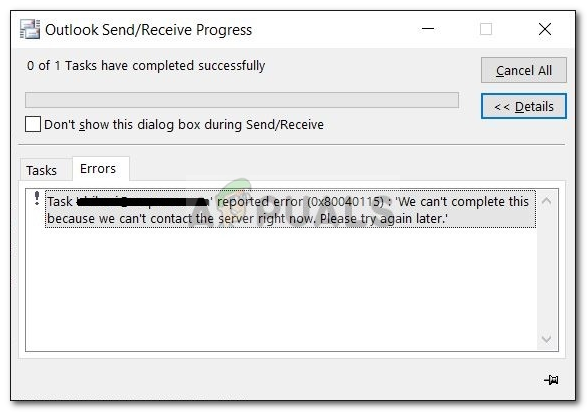 The Microsoft Outlook error 0x80040115 usually occurs due to an oversized .PST (Personal Storage Table) file or improper installation of the Outlook application. Users have reported that whenever they try to send an email using Microsoft Outlook, they are presented with the error ‘We can’t complete this because we can’t contact the server right now’ message.