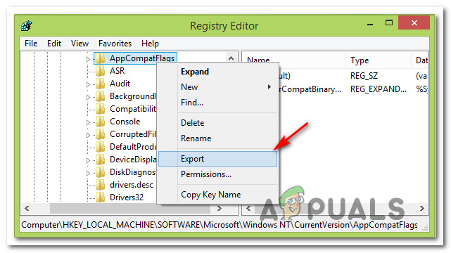- Right-click on the AppCompatFlags key and select Export. Save the file to a convenient location for backup.