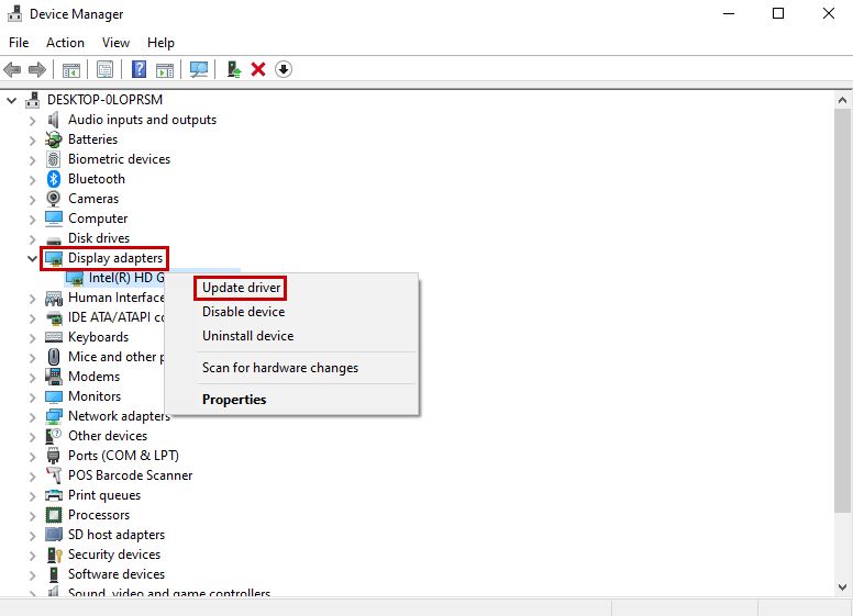 - Locate Display Adapters and Right Click your Display Adapter.