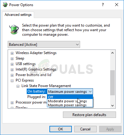 - Click the small plus button next to the PCI Express entry on the list in order to expand it. Do the same for the Link State Power Management Change the Setting option to Off by clicking on it.