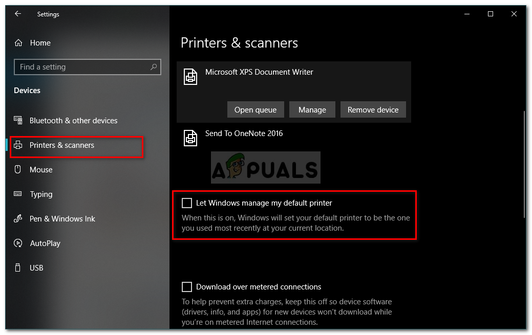 - Untick ‘Let Windows manage my default printer’ and then select the printer you want to use.