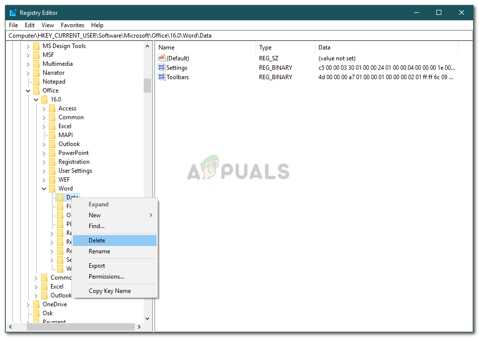 - Right-click on the Data key and select ‘Delete’.