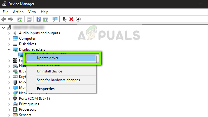 - Once in the device manager, expand the category of Display adapters, right-click on the graphics hardware, and select Update Driver.