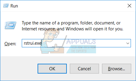 Note: If you’re still encountering problems after the restart, continue with the steps below. - Press Windows key + R to open another Run window. Type “rstui.exe” and hit enter to open the System Restore window.