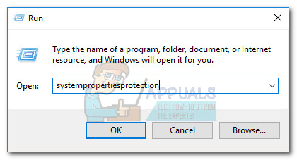 - Press Windows key + R to open up a Run command. Type “systempropertiesprotection” and hit Enter to open the System Protection tab of System Properties.