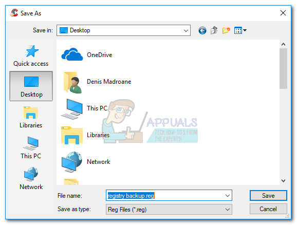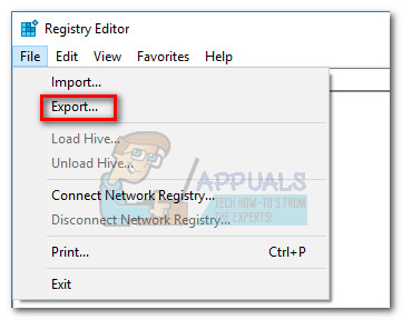 Note: If you’re not given the option to backup your registry, you can also do it manually. To do this, open a Run window (Windows key + R), type “regedit” and hit Enter to open Registry Editor. Once you’re there, go to File and choose Export. Then, simply choose the name and the location of your backup file.