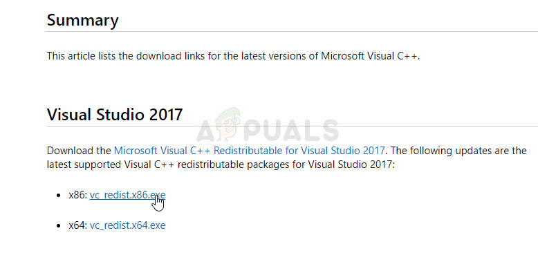- Click Finish when the uninstaller finishes with the process and repeat the uninstalling process for all versions of the Visual C++ Package. Now, you will need to reinstall Visual C++ by locating it here. Select the version you want to download and choose the download according to your processor (32-bit or 64-bit).