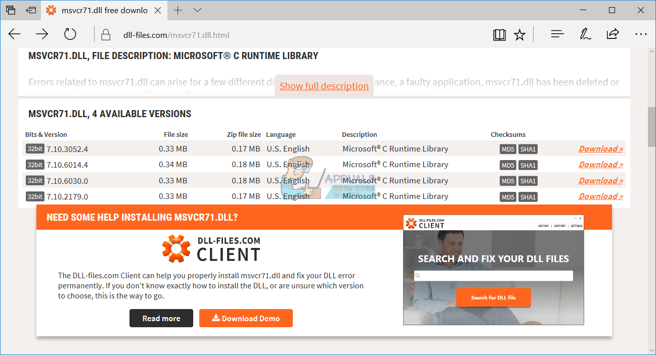 - Website will open a list of available msvcr71.dll files. You need to download proper version by clicking to Download, at the right side of list.