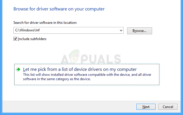 - Choose the “Browse my computer for driver software option” and click the “Let me choose from a list of device drivers on my computer”.