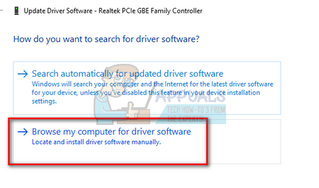 - Select the second options “Browse my computer for driver software”. Browse to the driver you downloaded and install it accordingly. Reboot your computer and check if the Ethernet cable gets detected.