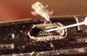 - Dip a small cotton swab in rubbing alcohol and insert it into the port. With rotational movements make sure you remove any of the remaining dirt that might be present on the gold connectors.