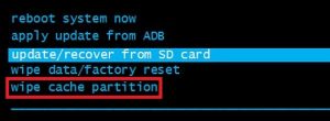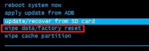 - Use the volume keys to navigate downwards and highlight Wipe data/factory reset.