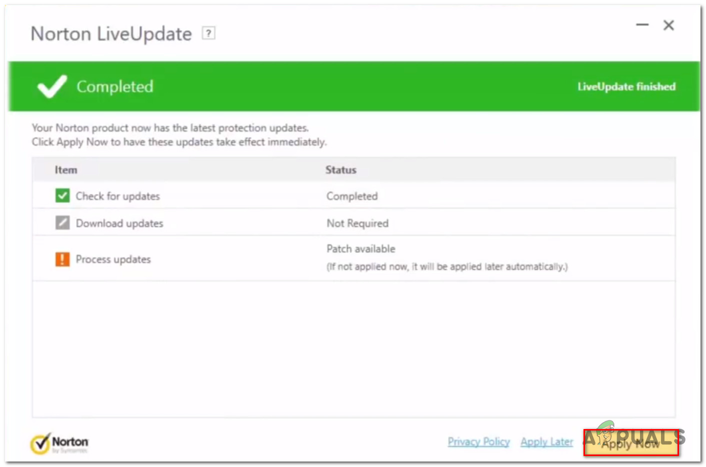 This is the standard procedure recommended by Norton when this error code is encountered. But this is also confirmed to work by a lot of affected users – most affected users that received this error have reported that once they updated the client with the latest version using LiveUpdate the issue went away completely.