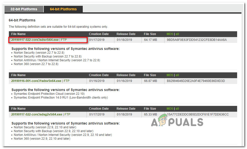 - Visit this link (here) and start by choosing the appropriate 32-bit Platform. then, select a definition set applicable to the Norton product that you’re trying to repair. In our case, we’re trying to update the definitions for Norton 22.7, so we are downloading the first installation executable.
