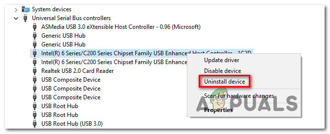 Inside Device Manager, expand the Universal Serial Bus controllers, right-click on your USB host controller and click Uninstall Device. If you have two different USB Host Controllers, uninstall both. Uninstalling the USB Host Controller from via Device Manager