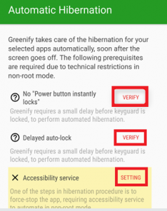 - Depending on your phone model, this next step might look different on your screen. Make sure you Tap the Verify/Setting button on each prerequisite and make the required modifications. This will give Greenify the time to perform hibernation chores whenever you lock your device.