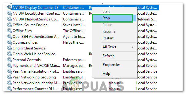 Opening services by typing “services.msc” in the RUN command. - Right-click on the “Nvidia Display Container Local System” option and select the “Stop” option.