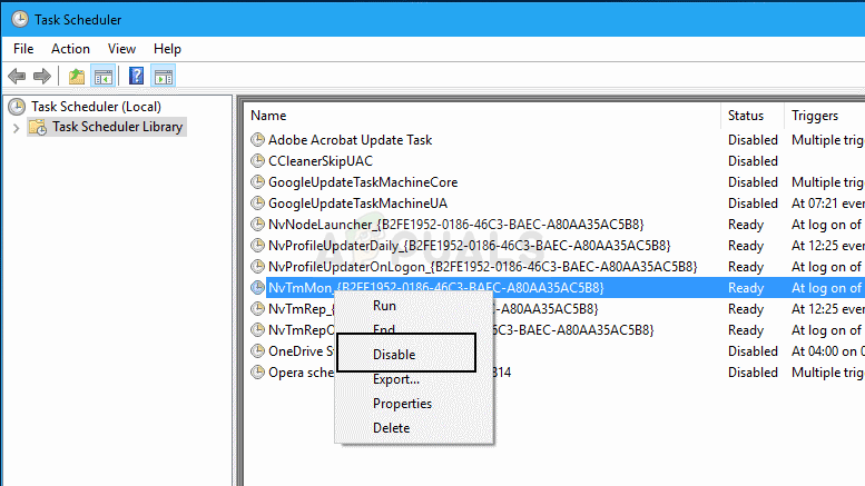 - The task is located under Task Scheduler Library. Locate all tasks whose name begins with ‘NvTm’, right-click on them, and choose Disable from the context menu which will appear. Repeat the same process for each entry.