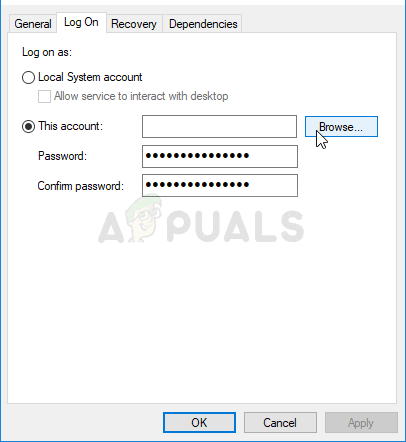 - Follow steps 1-3 from the instructions above in order to open the service’s properties window. Navigate to the Log On tab and click on the Browse… button.