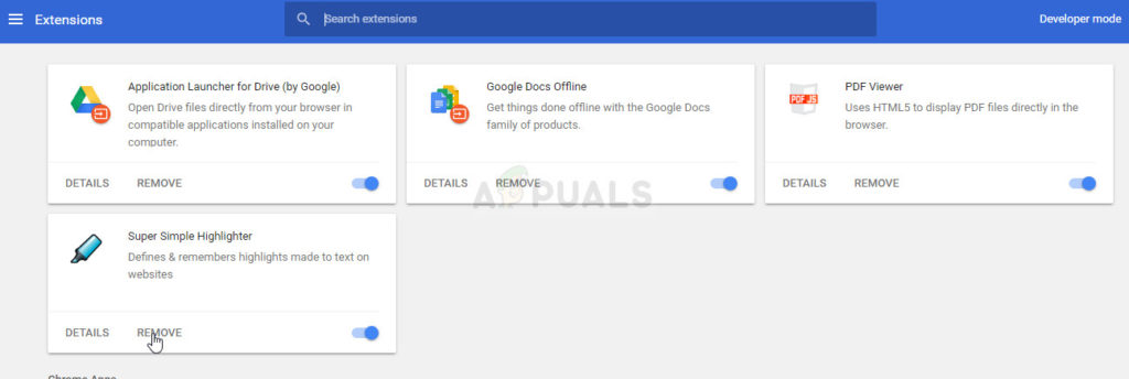 - Locate the extension you want to get rid of and click on the Remove button next to it to remove it from Chrome permanently.