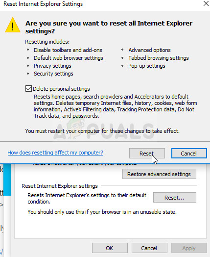 - Navigate to the Advanced tab, and then click on the Reset option. Select the Delete personal settings check box if you would like to remove browsing history, search providers, Accelerators, home pages, and InPrivate Filtering data. This is recommended if you really want to reset your browser but selecting this is optional.