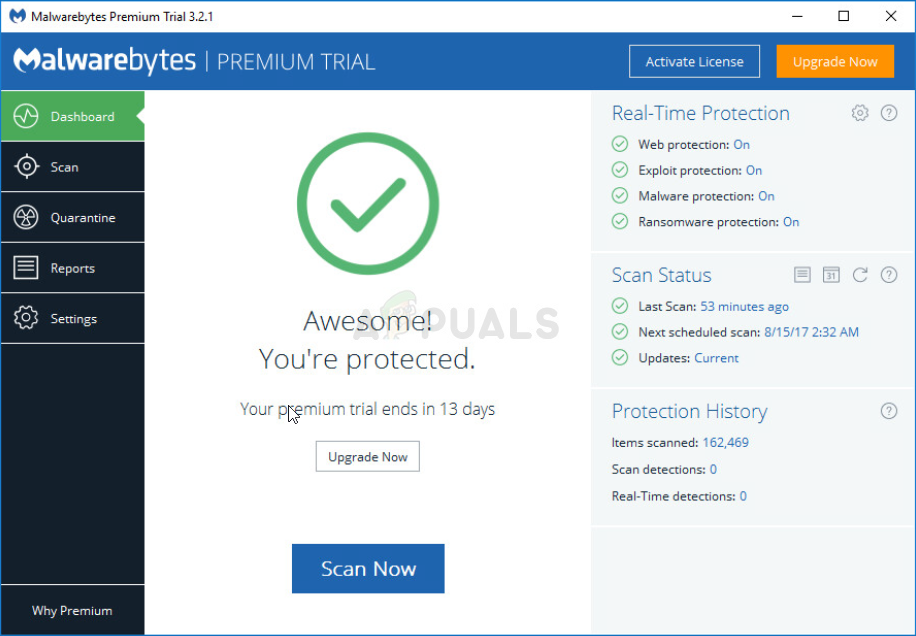 The best bet is to get rid of malicious apps by using Malwarebytes Anti-Malware which is a great antivirus tool with a free trial version. Fortunately, you won’t need the program after you solve this issue so make sure you download the free trial version from here.