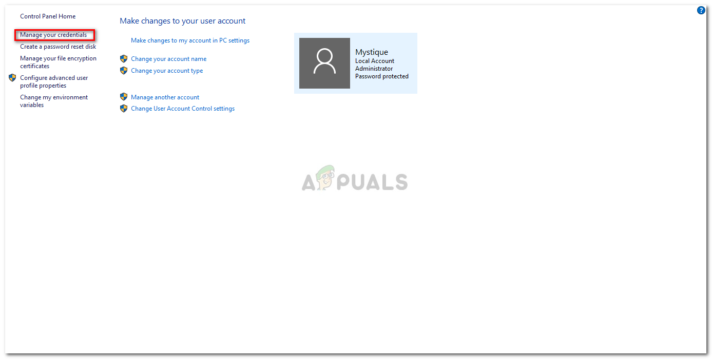 Windows Control Panel - On the left-hand side, click ‘Manage your credentials‘.
